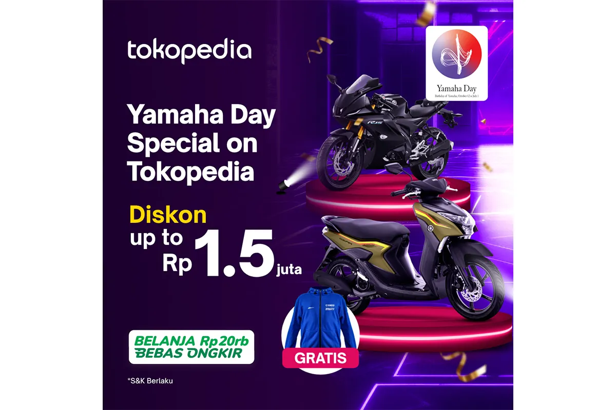 Suguhan menarik bagi konsumen bisa diperoleh dari salah satu e-commerce di Indonesia dalam program Yamaha Day Special on Tokopedia yang berlangsung hingga 31 Juli 2023. Kolaborasi ini berlaku untuk pembelian Gear 125 Series, R15 Series dan Jupiter Z1 di Tokopedia dengan mendapatkan diskon 3% up to Rp 1,5 juta + jaket eksklusif Yamaha*.